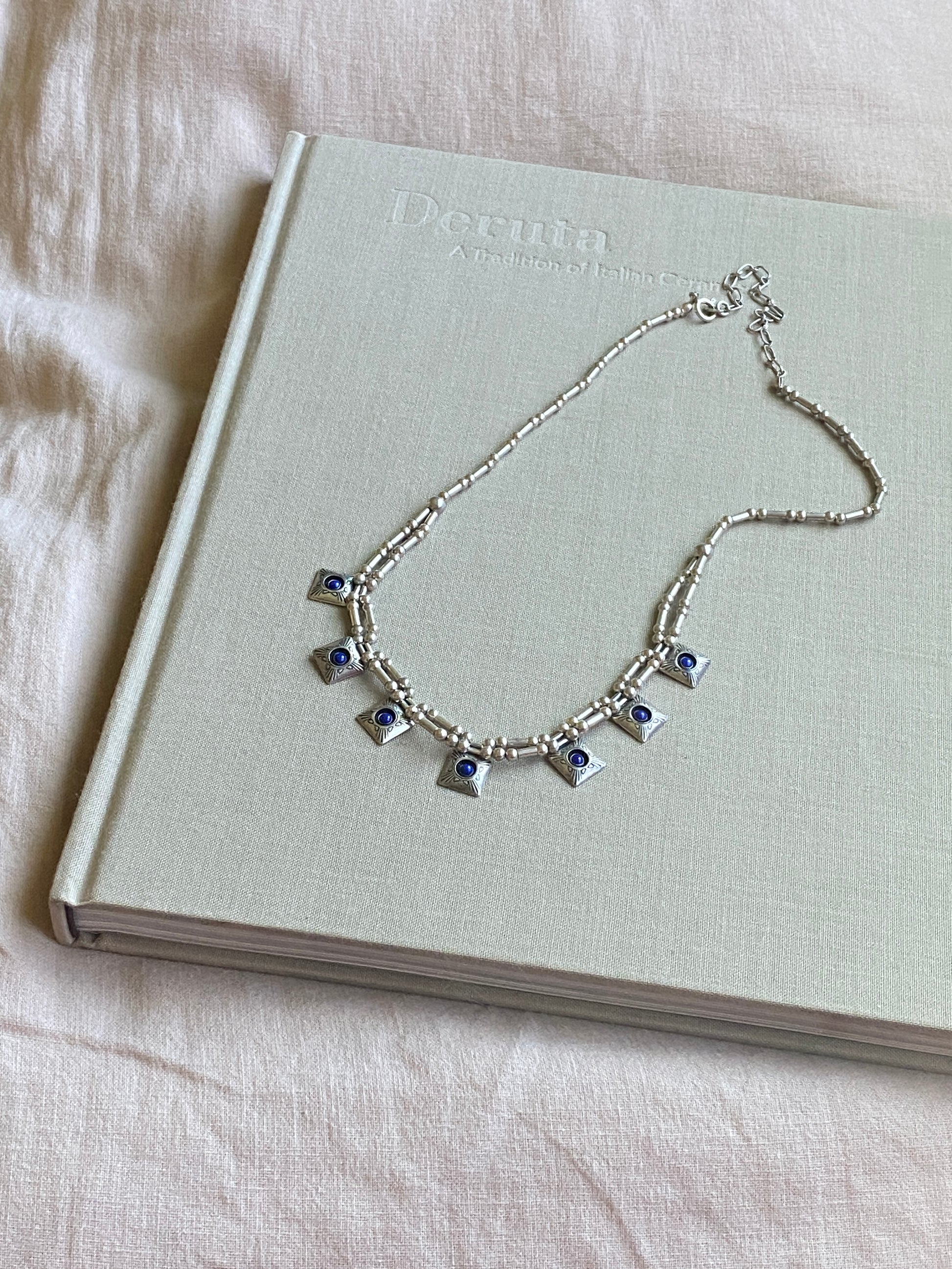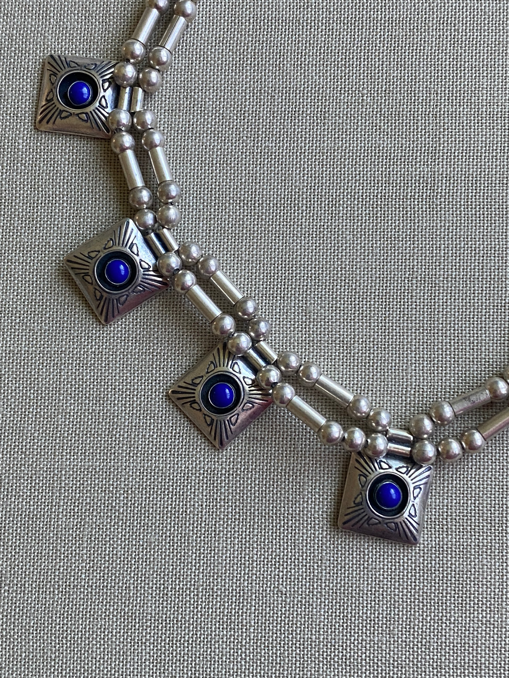 vintage sterling silver beaded necklace with square carved lapis drops. adjustable 4" attached for ease. she looks darling laying right below the collarbones.